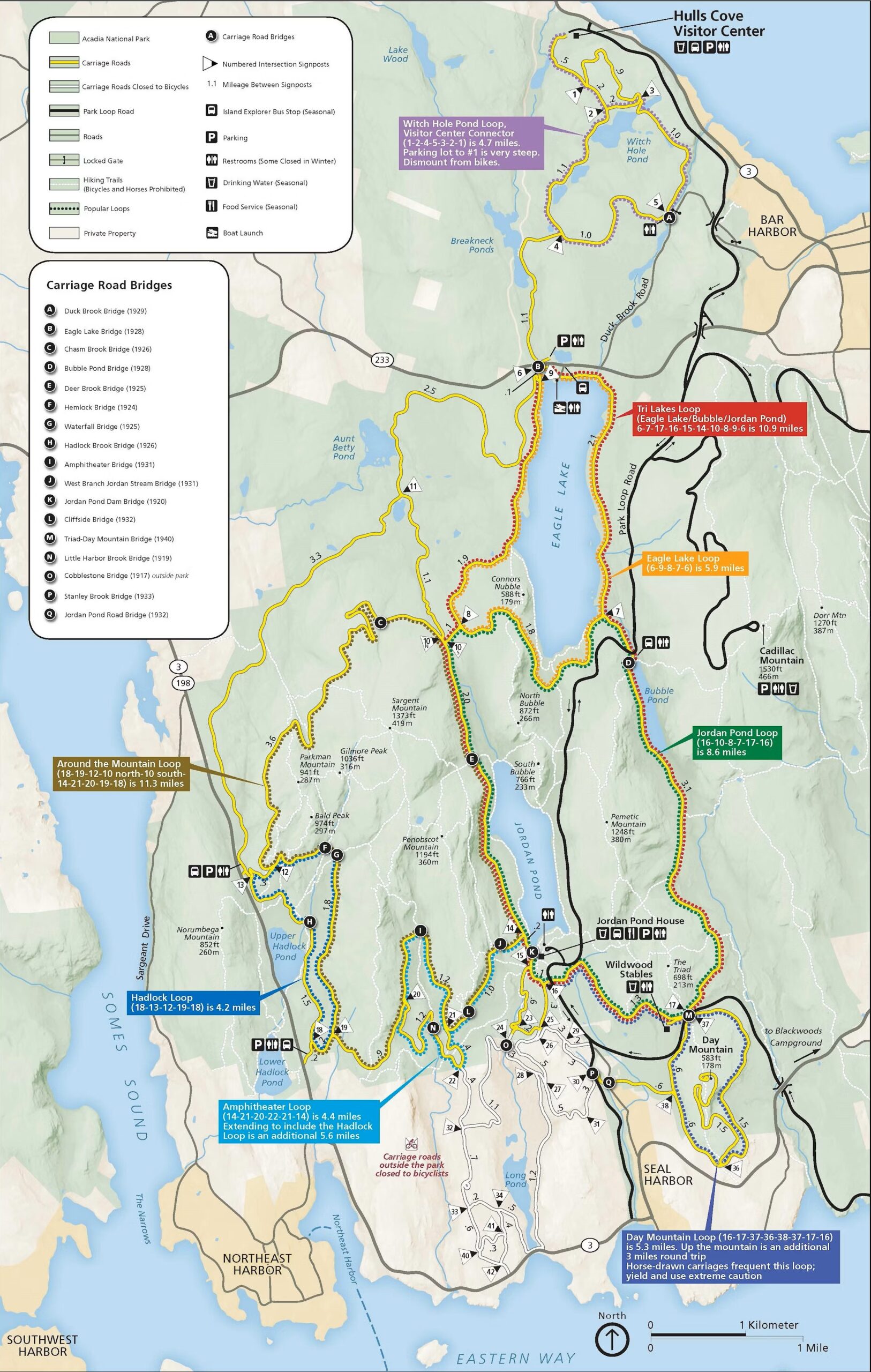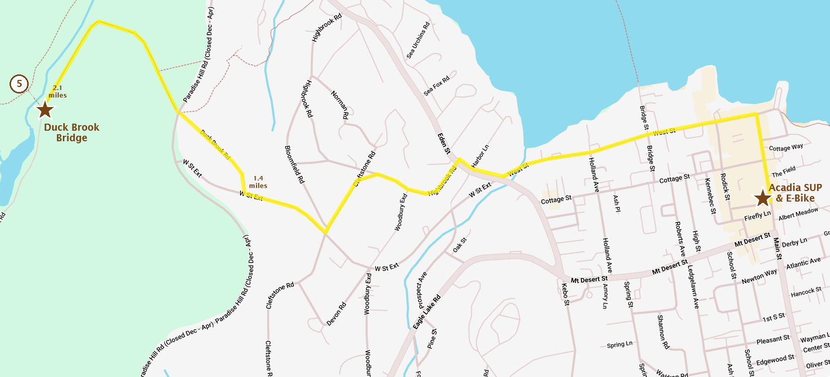 Our Shop is a short 1.4 mile ride to the Duck Brook Road car free access point to the carriage roads and 2.1 miles to Duck Brook Bridge. The ride is easy on an e-bike and well traveled by thousands of cyclists every year.